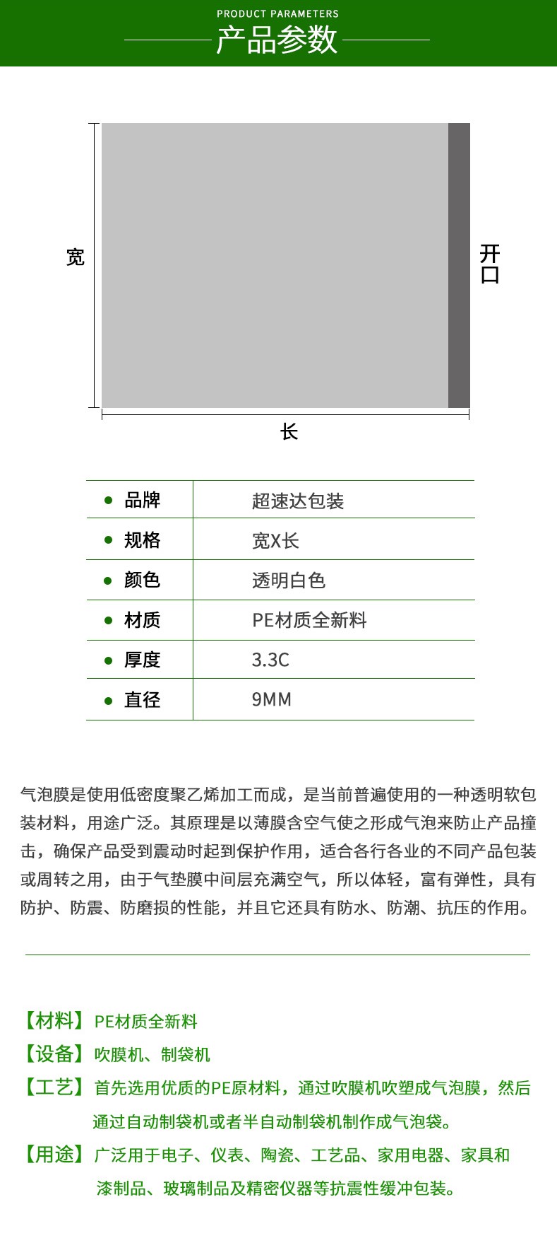 氣泡袋,又叫氣墊膜,氣珠膜,氣泡膜,氣泡紙,是采用LDPE低密度聚億烯樹脂加工而成。氣泡袋分為單面和雙面兩種,單面氣泡袋適宜保護(hù)自身重量較輕的產(chǎn)品,雙面氣泡袋防震力強(qiáng)適合體積較大較重之物品包裝。單、雙面氣泡袋均適合各行業(yè)產(chǎn)品的包裝如做袋、切片。單、雙面氣泡袋可設(shè)防靜電氣泡袋,以及不同顏色、印刷.還可復(fù)合其它材料增加保護(hù)性及美觀。主要產(chǎn)品有單面氣泡袋、雙面氣泡袋、加厚氣泡袋、紅色氣泡袋、白色氣泡袋、防靜電氣泡袋。